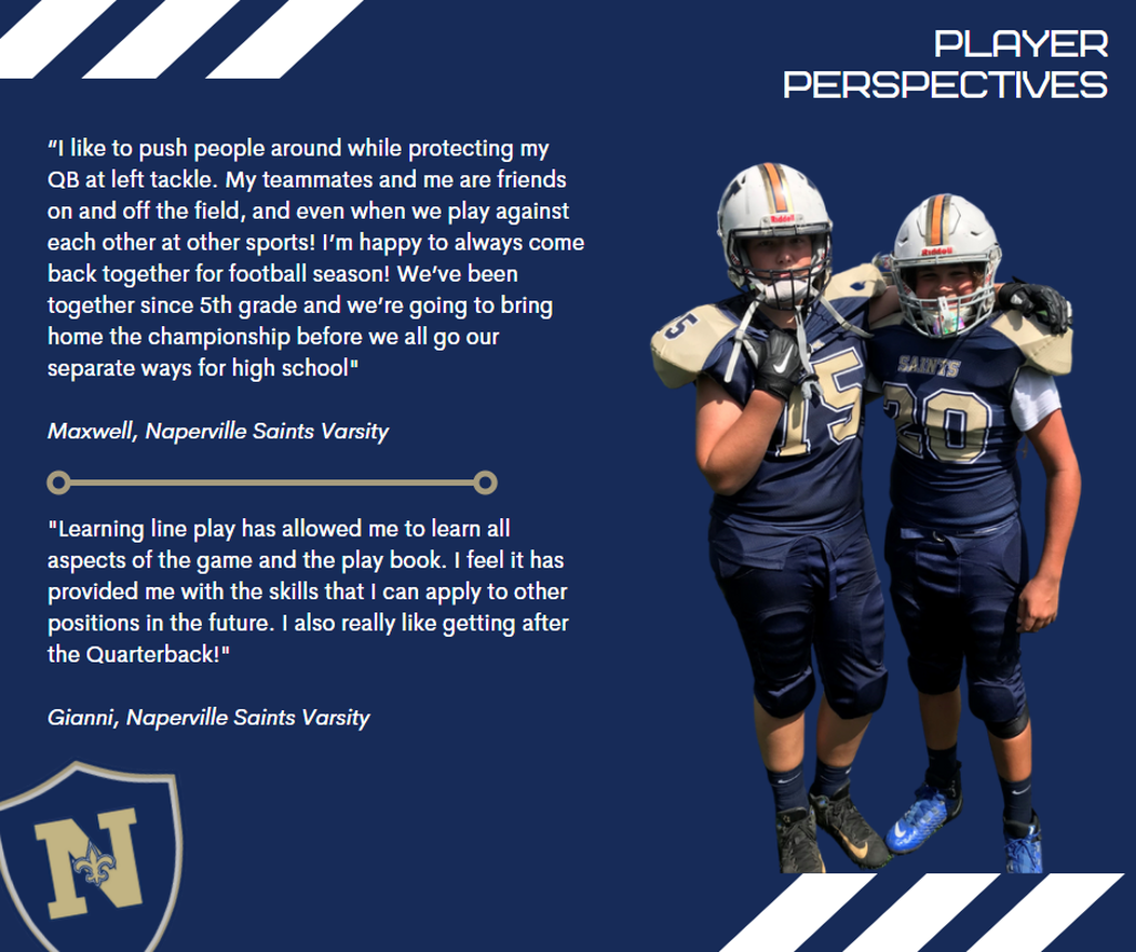 Lineman do battle in the trenches on every single play. Some players may not have contact with their opponent in each play, but lineman do as they compete man-to-man, moving another player off the ball. They must be strong, fast off the ball and have an intelligent mind for the game as they execute plays. Naperville Saints lineman learn many technical skills including blocking, pass rushing, down-blocks, pulls and downfield blocks.