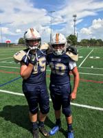 The Naperville Saints belong to the Bill George Youth Football League (BGYFL) who have long implemented weight restrictions by player age. The restriction is a safety and even-competition measure. Those players above a certain weight in their age group are deemed “stripers” and are only allowed to play on the offensive and defensive line. You will see players with a distinct stripe decal down the middle of their helmet, examples in the pics below. They are the stripers. See the table in the images below for striper weights, and reference the BGYFL website for the official table, link HERE.