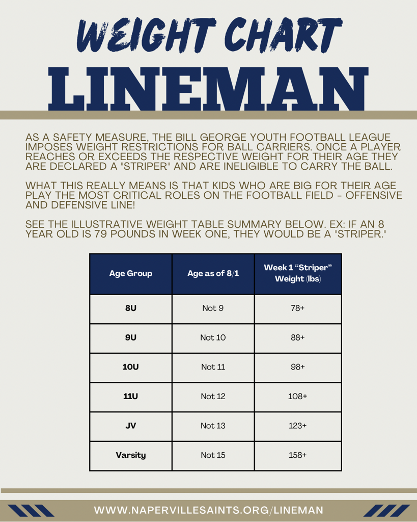 Note that many Naperville Saints lineman are NOT stripers. We have some of our fastest and strongest players on the line who are under the weight limit.